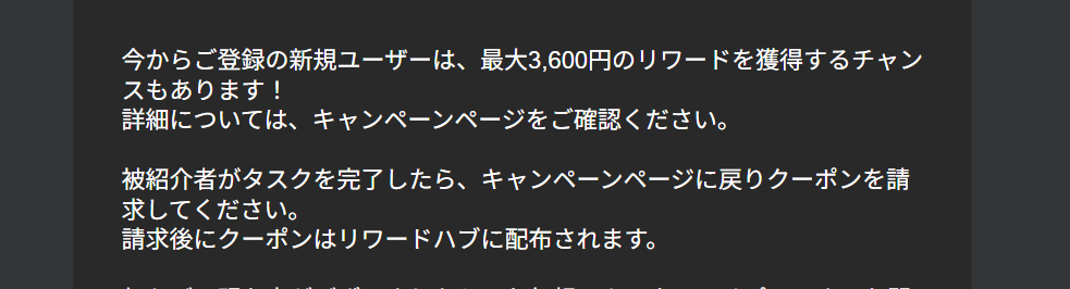 お待ちいただきありがとうございます。確認したところ、新規登録お客様向けに3,600円の報酬がもらえるタスクがございます。お客様のアカウントでは表示されていなくても、新規登録されたアカウントではこのタスクが表示され、登録後に10,000円を入金することで参加可能です。