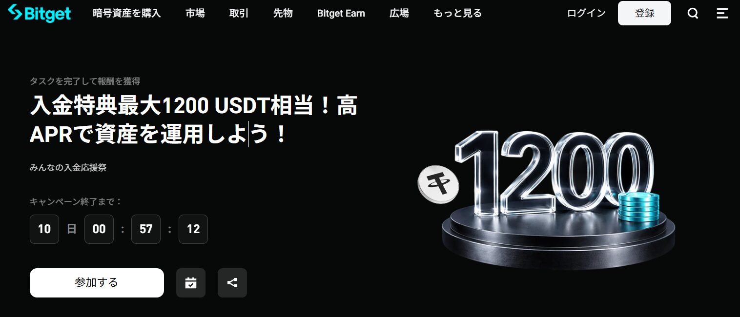 2026年1月21日から2026年2月11日のキャンペーン期間中、Bitgetで「みんなの入金応援祭」が開催され、キャンペーン期間中に初回入金を行うと最大1200USDTの特典がもらえます。