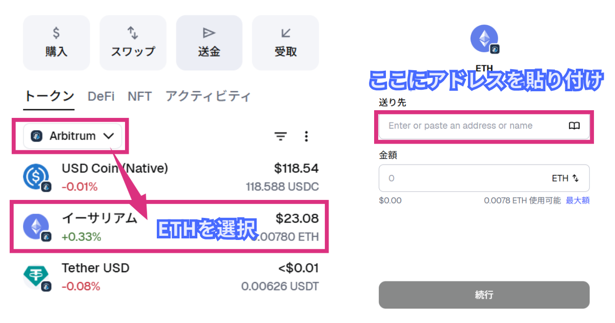 メタマスクでArbitrumのETHを選択して「送金」に進みます。