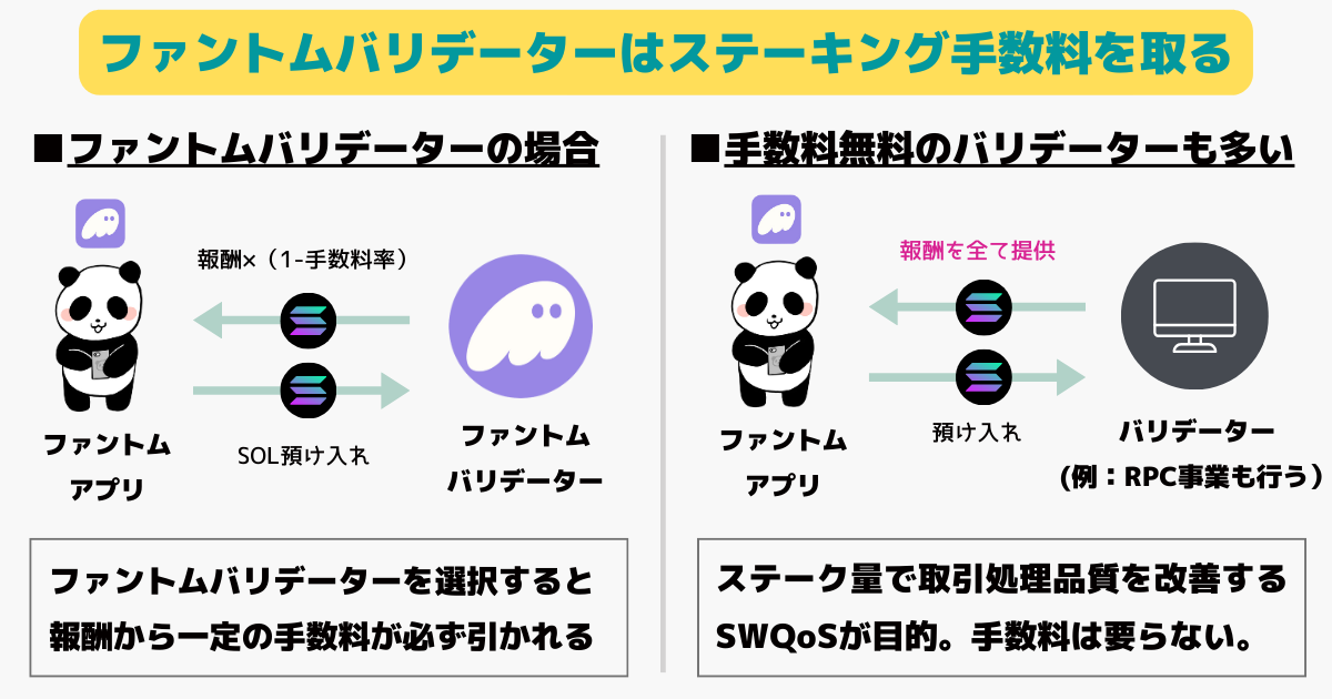 ファントムウォレット(Phantom Wallet)がSOLステーキング手数料(コミッション)で4%を徴収する一方、手数料無料で稼いだ報酬全額をユーザーに付与する設定にしているバリデーターも多いです。