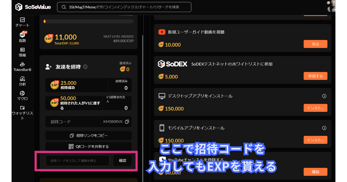 既に紹介リンクなしでSoSoValueを始めてしまった場合でも、EXP画面の左下にある「招待コードを入力して報酬を得る」の欄に招待コード「68XYMVQJ」を入力することでEXPを受け取れます。
