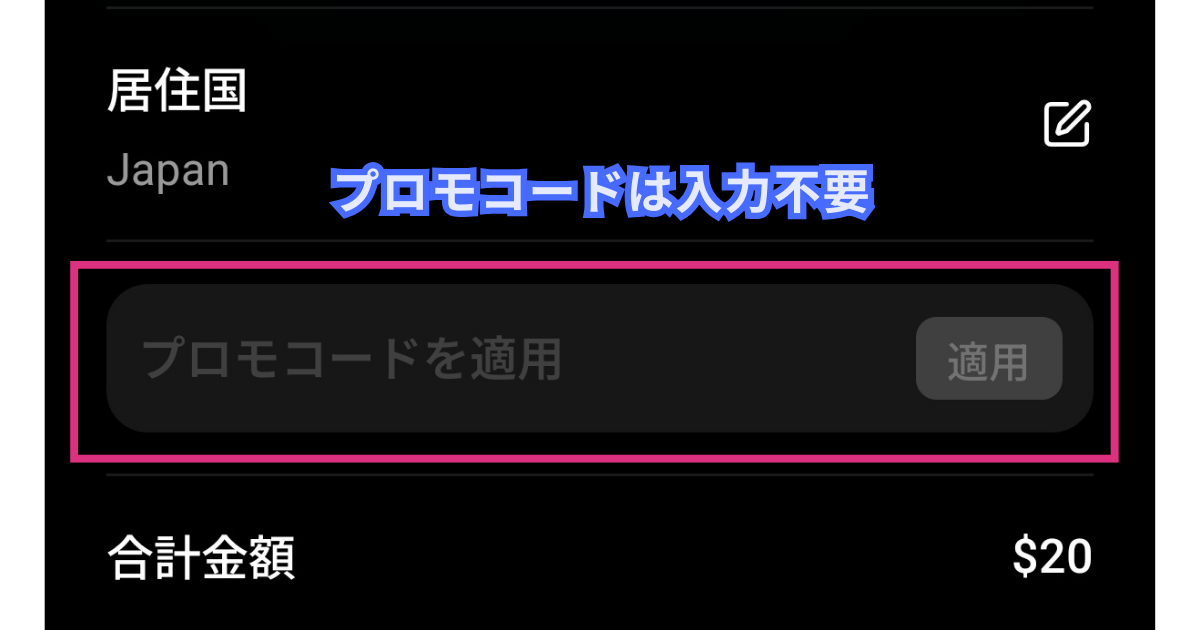 Triaのカード発行画面で表示される「プロモコードを適用」の欄にプロモーションコードを入力する欄がありますが、こちらは何も入れる必要はありません。